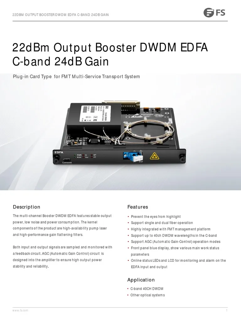 High-capacity fiber optic networks demand precise signal amplification, ultra-low noise performance, and long-distance transmission stability. In modern DWDM (Dense Wavelength Division Multiplexing) infrastructures, optical amplification plays a critical role in maintaining signal integrity across metropolitan, regional, and long-haul fiber links. The FS Booster DWDM EDFA with 22dBm output power and 24dB gain is a carrier-grade optical amplifier plug-in card engineered to deliver reliable C-band amplification, efficient power boosting, and seamless integration into professional optical transport systems.